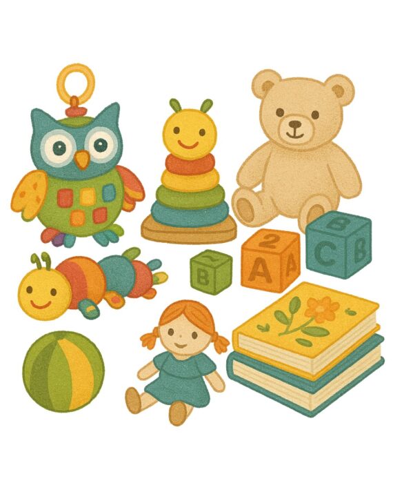 A selection of toys and books, chosen to match the age of the baby. We try to include around 10 toys and at least 5 books. We can offer toys and books suitable for babies and children up to age 5 years.
